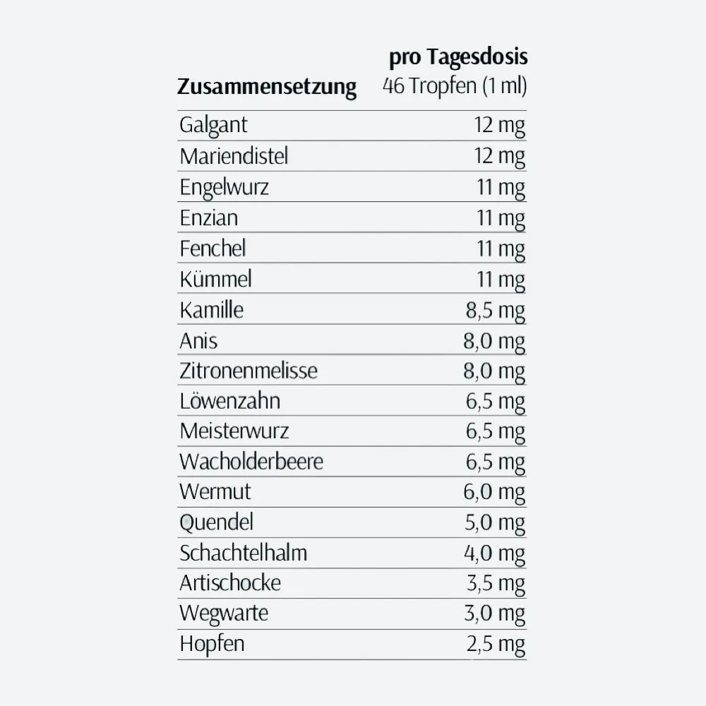 ✓ Extrakt aus 18 kostbaren Kräutern und Gewürzen: Galgant, Mariendistel, Engelwurz, Enzian, Fenchel, Kümmel, Anis, Zitronenmelisse, Löwenzahn, Meisterwurz, Wacholderbeere, Wermut, Quendel, Schachtelhalm, Artischocke, Wegwarte, Hopfen, Kamille